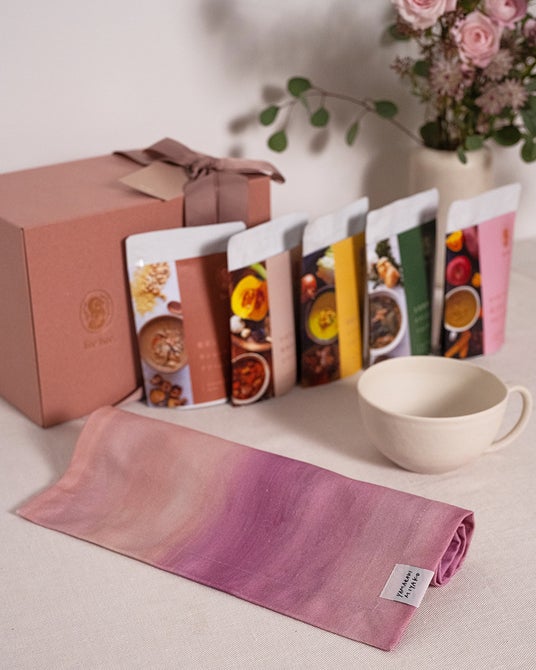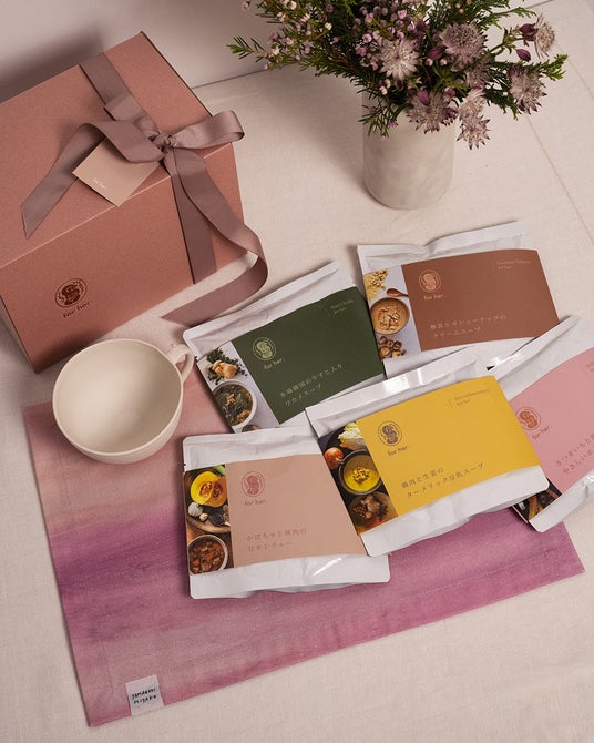 本セットは、山崎美弥子氏の絵画をデザインに取り入れたランチョンマットと、「for her.」のこだわりが詰まったスープを組み合わせた贈り物として最適な商品です。