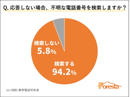 携帯電話所有者500名のうち不明な電話番号からの着信に対し「応答しない」と回答した方を対象に「不在応答となった後にインターネットなどで不明な電話番号を調べるか」というアンケートを行ったところ、94.2%の方が「はい」と回答しました。