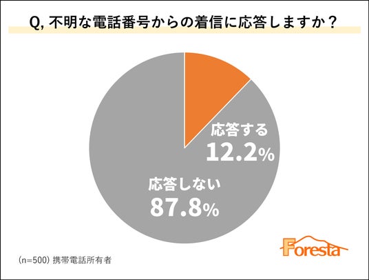 携帯電話の所有者500名に「自身の携帯電話宛に不明な電話番号から着信があった場合、応答するか否か」についてアンケートしたところ、500名のうち約87.8%の方が「応答しない」ことが判明しました。