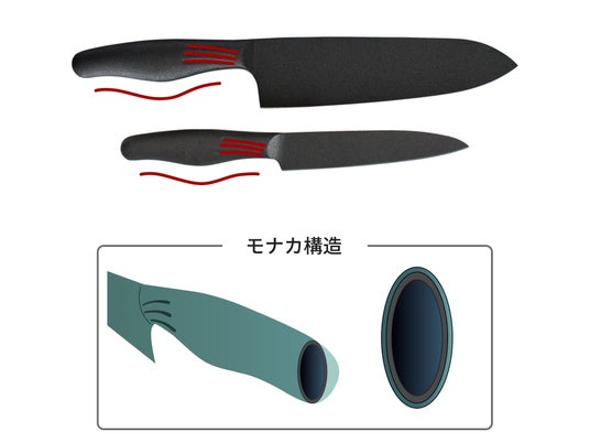 根元にある3本ラインで滑りにくく、またハンドル内部は【モナカ構造】を採用し、オールステンレスでも軽く、手首への負担を軽減します。