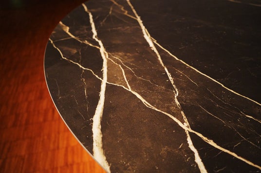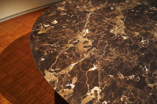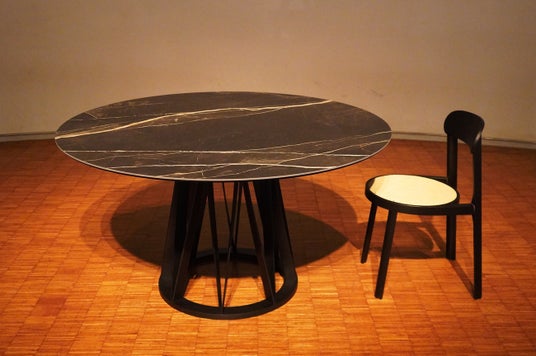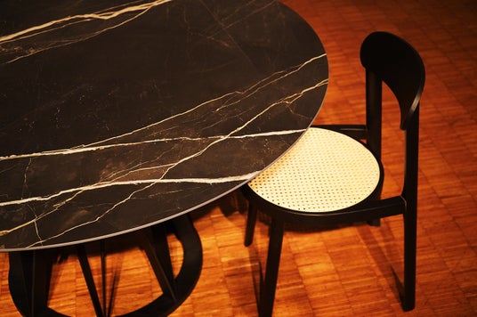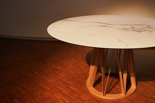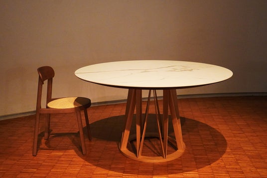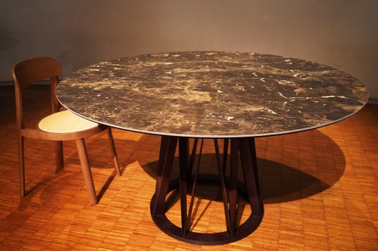 日本の組木細工にも通ずる陰影を生む木製の脚部は和のテイストも醸し出しながら、セラミックの厳かな趣の天板と意外なマッチングを見せてくれます。直径140cmの円形テーブルは室内のスペースを生かし、チェアに腰かけた時も脚部が邪魔にならずすっきりと使用することが出来ます。弊社IL DESIGN(イル デザイン)のプレゼンテーションプレイスに展示・商談にて使用中ですので是非お問合せの上、直接ご覧になってください。