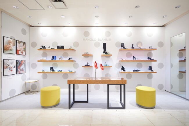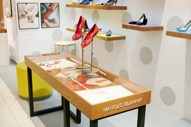 空間内には、ディスプレイテーブル、ボックスがあり、そこにはマノロ ブラニクの熟練した職人が各デザインを具現化するために使用する道具とマテリアルが展示され、ブラニクの作品の精巧さが際立つ演出となっています。シグネチャーであるグレーのポルカドット(水玉模様)の壁紙に囲まれたインスタレーションでは、マノロ ブラニクのファクトリーを写真で紹介し、彼の最もアイコニックなシューズである「ハンギシ」の製作過程を描写します。本ポップアップのために厳選されたシューズは、大胆なカラーが目を引く棚にディスプレイされ、それぞれのスタイルを引き立てます。同時にウッド調の仕上げが美的な調和を保ち、クラフツマンシップのテーマへの高い敬意を示しています。