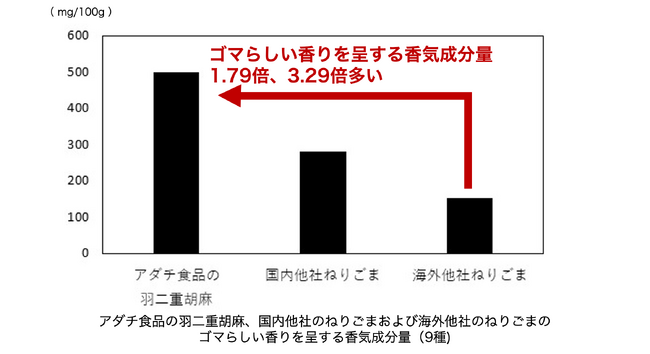 その結果、「絹羽二重胡麻」は国内大手他社および海外他社の練り胡麻と比較して、総有機酸量(コクの深さ)が1.30倍、3.02倍、グルタミン酸量(旨味の強さ)が1.55倍、2.45倍、粘性(きめ細やかさ)が0.72倍、0.43倍、ゴマらしい香りを呈する香気成分量が1.79倍、3.29倍、また、酸化臭等が0.90倍、0.29倍であることを証明。「絹羽二重胡麻」は、コクと旨味が強く、きめ細やかで香り高い練り胡麻であることが明らかになりました。