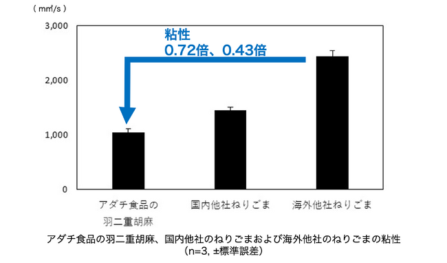 「絹羽二重胡麻」の粘性は国内他社および海外他社の練り胡麻と比較して0.72倍、0.43倍