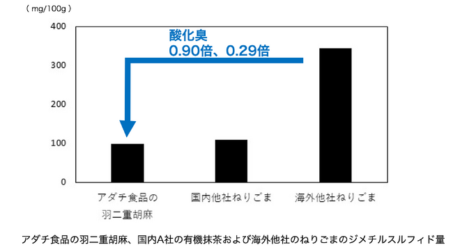「絹羽二重胡麻」の酸化臭等のオフフレーバー量は国内他社および海外他社の練り胡麻と比較して0.90倍、0.29倍