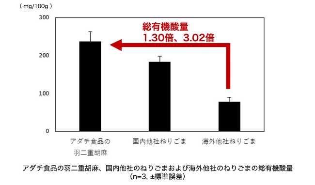 コクを呈する総有機酸量について、アダチ食品の絹羽二重胡麻は237.02mg/100gであり、国内他社の練り胡麻の182.95mg/100g、海外の練り胡麻の78.53mg/100gと比較して、1.30倍、3.02倍でした。したがって、アダチ食品の絹羽二重胡麻は、国内他社および海外他社の練り胡麻と比較してコクが強い練り胡麻であることが明らかとなりました。