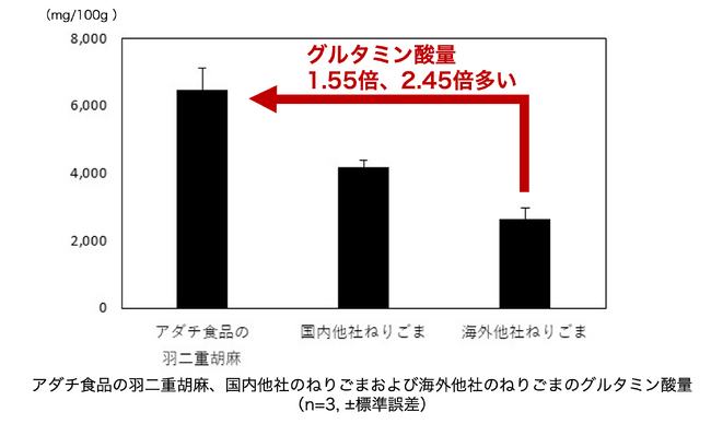 旨味を呈する代表的な成分のグルタミン酸量について、アダチ食品の絹羽二重胡麻は6480.50mg/100gであり、国内他社の練り胡麻の4181.80mg/100g、海外他社の練り胡麻の2650.30mg/100gと比較して、1.55倍、2.45倍でした。したがって、アダチ食品の絹羽二重胡麻は、国内他社および海外他社の練り胡麻と比較して旨味が強い練り胡麻であることが明らかとなりました。