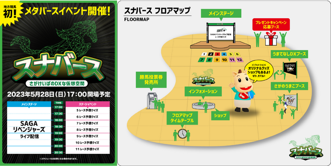 佐賀競馬(佐賀県競馬組合:佐賀県鳥栖市江島町、管理者:南里隆)は、地方競馬初の取り組みとして、メタバース技術「めちゃバース」を活用したオンラインイベント「スナバース」を5月28日(日)九州ダービー栄城賞に合わせて開催します。本イベントは2022年度キャンペーン「うまてなし」が2023年度にパワーアップした「うまてなしDX」の一環として行われるもので、遠方にお住まいのお客様にも佐賀競馬を楽しんでいただくための試みとなります。