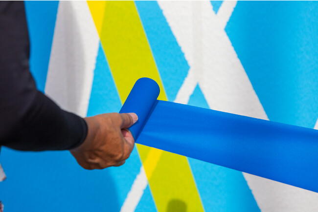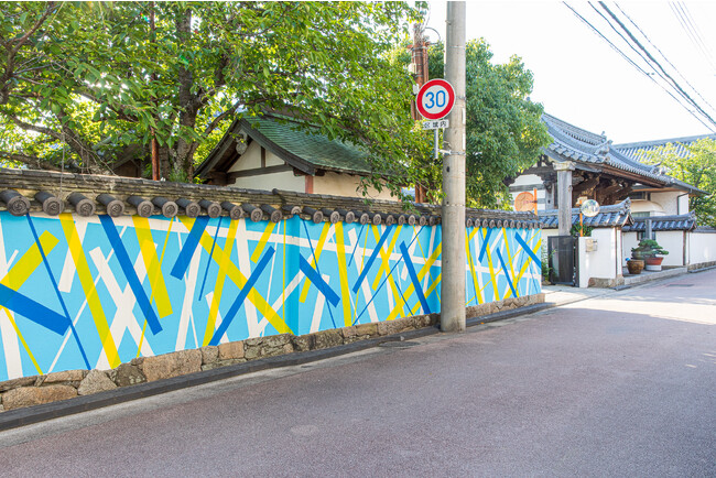 壁にマスキングテープの下地を貼りペンキとマスキングテープで装飾する施工方法を用いています。下地にマスキングテープを貼ることで、模様替えなどが簡易にできる施工方法をご覧いただけます。Fstudioは1級建築事務所なので、営業日に外からの観覧のみとなりますので営業日についてはS BRICK(0799-24-0550)へお問い合わせください。なお、遍照院・Fstudioも車でお越しの方は近くの有料駐車場に駐車いただくことを推奨します。S BRICKから街歩きとして巡回することができます。その際は散策マップをご活用ください。