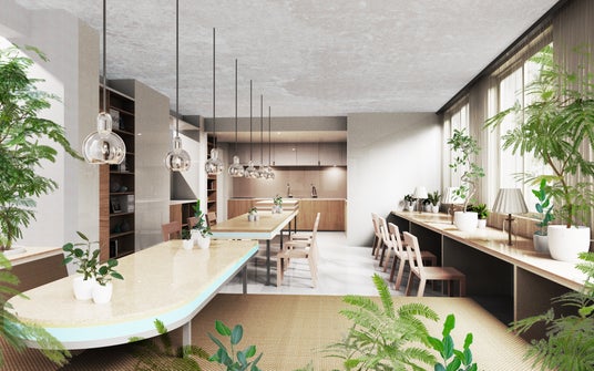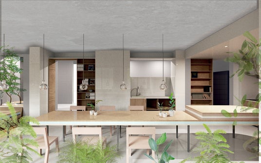 - - 自然光が降り注ぐ、たくさんの緑を配置した共用部には、リビングダイニング、ワークスペース、キッチン、ランドリースペースを完備
