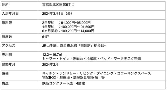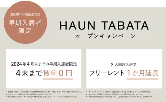HAUN TABATAのオープンに際し、フリーレントキャンペーンを実施中です。2024年3月1日~4月末までにご入居いただくお客様に限り、賃料が4月末まで0円となります。また、ご友人・ご家族など、2名同時にご入居いただいた場合には、さらに1ヶ月延長で、フリーレントを適応いたします(1年または2年契約限定)。引越しシーズンにお得なキャンペーンとなっております。ぜひお早めにご検討ください。