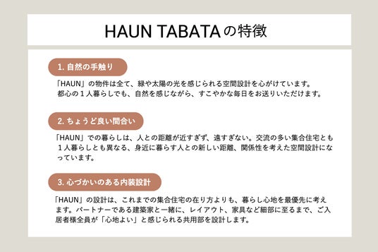 HAUN株式会社(東京都港区六本木6-2-31、代表:吉嶋法生)は、この度、暮らし心地にこだわるコリビング賃貸住宅「HAUN(ハウン)」の第一棟目となる「HAUN TABATA(ハウン田端)」が2024年3月1日(金)に開業することをお知らせします。開業に合わせて、2024年3月2日(土)にオープニング特別内覧会・イベントを開催いたします。