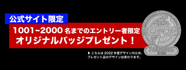 5/17のエントリー開始にあたっては、先着1000名様限定でCBTRオリジナルバッジ(非売品)のプレゼントキャンペーンをしておりましたが、予想を遥かに上回る反響をいただいたことから、急遽追加の感謝キャンペーンとして、公式サイトからラリーにエントリーいただいた1001~2000名までの方限定で、公式グッズとして販売予定の「オリジナルバッジ」をプレゼントいたします。