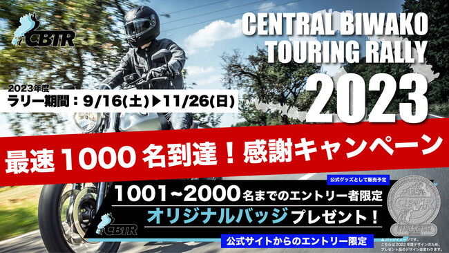 滋賀県の琵琶湖をバイクで1周しながらデジタルスタンプを集めるバイクツーリングイベント「CBTR (Central Biwako Touring Rally)2023」(企画・運営:株式会社ご当地ツーリング(本社:神奈川県藤沢市、代表取締役:櫻井俊輔))では、事前エントリーが5/17(水)12:00のスタートから最速で1000人を突破したことへの感謝を込めて、公式サイトからのエントリー者を対象としたオリジナルバッジのプレゼントキャンペーンを実施いたします。