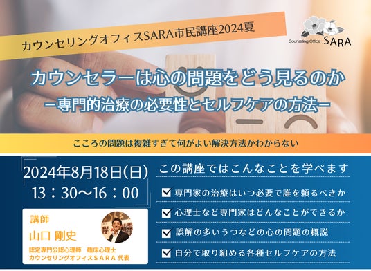 NPOカウンセリングオフィスSARAは、2024年8月18日(日) 13:30から東京都町田市で市民講座「カウンセラーは心の問題をどう見るのか-専門的治療の必要性とセルフケアの方法-」を開催いたします。カウンセリングオフィスSARAの代表の山口剛史(認定専門公認心理師・臨床心理士)が心の問題をどのように捉えるのか、どのような専門的治療が必要で、どのようなセルフケアができるのかについて解説します