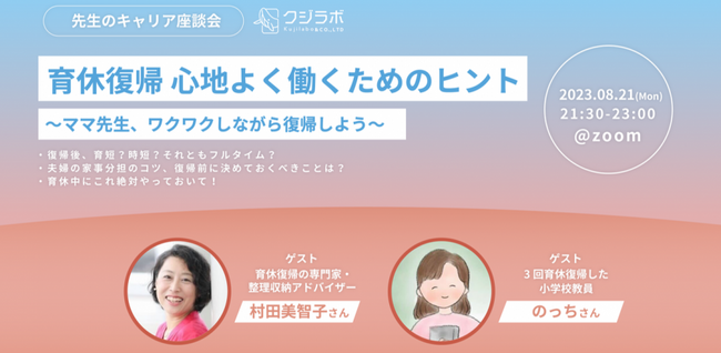 「教育のオープン化」をミッションに掲げる株式会社クジラボ(本社:福岡県福岡市、代表取締役:森實泰司、以下『クジラボ』)は、8月21日(月)21:30より、「育休復帰」をテーマにした先生のキャリア座談会をオンラインで開催いたします。