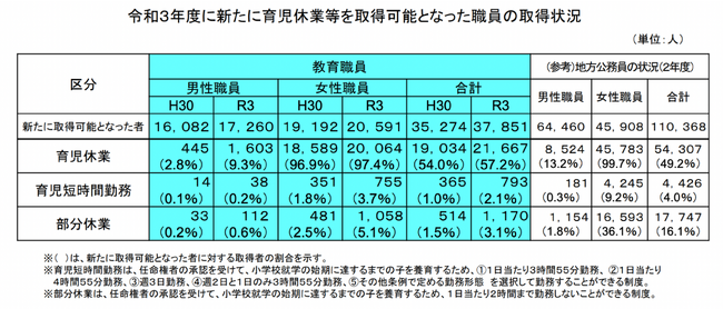 文部科学省が実施した【令和3年度 公立学校教職員の人事行政状況調査】によると、平成30年と比較すると育児休業の取得割合が「男性が6.5%、女性が0.5%」上がっており、教員の業界においても育児休業の取得率が上がってきていることが伺えます。