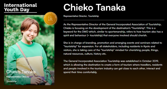 世界で初めて旅行者の心構えであるツーリストシップを提唱した、一般社団法人ツーリストシップ(本社:京都市上京区)は、2023年8月12日の国際青少年デーにDTTT社(本社:イギリス)が発表した世界の若者9人に、創業代表の田中千恵子がノミネートされたことにあたり、田中千恵子のコメントを掲出します。
