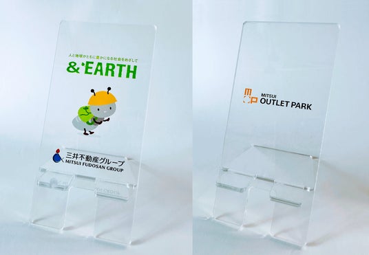 2023年の5月から7月に掛けて、北海道から九州までおよそ83ある三井不動産グループの商業施設から不要となったアクリルパーティション約24トンを回収。塩ビ製品や不純物の混じったアクリル板など再生に適さないものを取り除いた上で、緑川化成工業株式会社の施設で粉砕、溶解してリペレット化して、板状に成形しました。初回分としては、当社がその再生アクリル板を用いたスマートフォンスタンドをデザインし、株式会社プレンティが切断、プリントなどの加工を行い、完成したプロダクトを再び三井不動産グループの商業施設に納品し、SDGs関連のイベントでノベルティとして配布されました。不要となったパーティションをアップサイクルしたことで、一般的なバージン材を使用するプロダクトに比べて、製造時のCO2排出量を62% 削減することに成功しています。今回、再生したアクリル板は、今後も三井不動産グループの商業施設における店舗サインやフロア案内図など、各種アクリルを使用するシーンに活用される予定です。