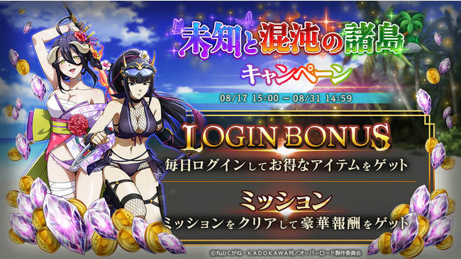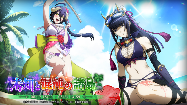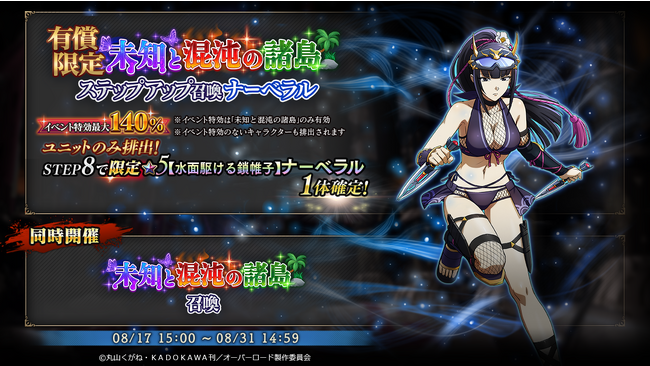 8/17よりイベント『未知と混沌の諸島』を実施!イベント連動召喚では『★5 【水面駆ける鎖帷子】ナーベラル』『★5 【水辺照らすくノ一】アルベド』も登場します!4.5周年記念キャンペーンも同時開催中!