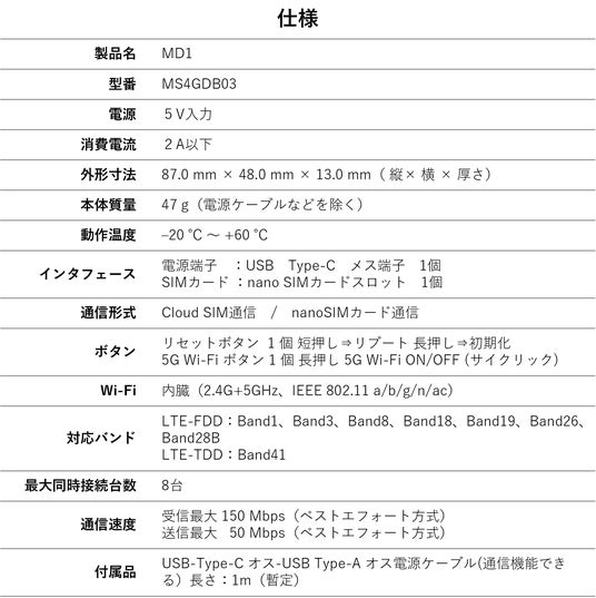 MD1(型番:MS4GDB03)はCloudSIM搭載。CloudSIMとは、異なる通信事業者の通信網や通信方式を1契約かつ1台の機器で使い分けることができる通信技術です。国内においては、docomo/au/Softbank/Rakutenの大手4事業者の通信網(エリア)を横断することができ、MD1の電源を立ち上げると位置情報を元に最適な電波に自動接続します。