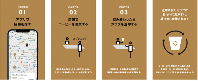 今まで通り気軽にテイクアウトでコーヒーを楽しみながらも、環境に配慮するために誕生しました。普段の使い捨てカップの代わりに、CUPLESのリユーザブルカップでテイクアウトして、飲み終わったらカップをお店に返却。そして、カップはお店で洗浄され次のユーザーへ再利用されます。「テイクアウト=使い捨て」ではなく、必要なときだけカップを借りてコーヒーがテイクアウトできるようになります。