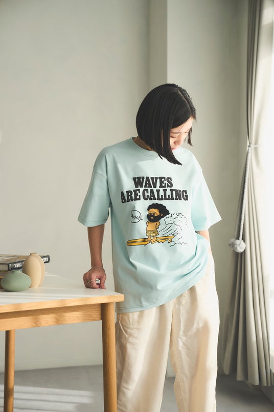Mojashは、その親しみやすいひげおじさんのキャラクターで多くのファンに愛されてきました。今回のTシャツコレクションでは、夏の海をテーマにしたデザインを展開。サーフボードを車に乗せて海に向かう姿、波乗りを楽しむ姿、ヤシの木陰でウクレレを弾く姿など、Mojashならではの遊び心あふれるプリントが魅力です。