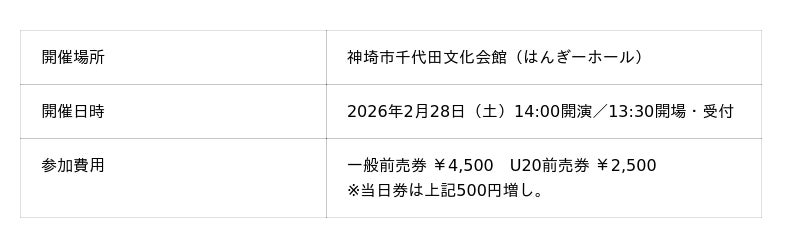 一般前売券 ¥4,500(税込) U20前売券 ¥2,500(税込)