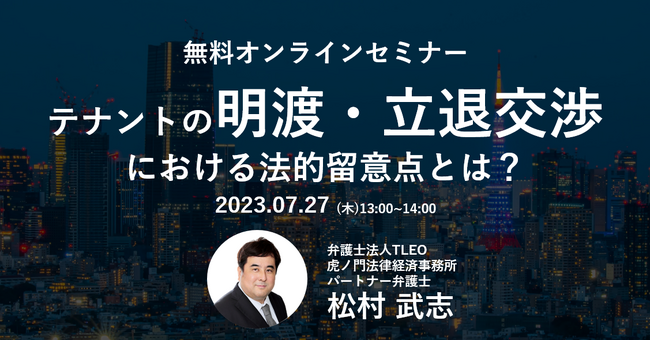 1972年の創業以来,数多くの不動産案件を解決してきた弁護士法人TLEO虎ノ門法律経済事務所(所在地:東京都港区、代表:千賀 修一)が、「テナントの明渡・交渉における法的留意点。弁護士の教える立退料増額交渉の急所とは」をテーマにしたセミナーを無料・オンラインで2023年7月27日(木)に開催いたします。