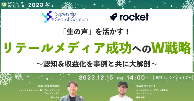 全国の大手リテールを横断し、月間1.6億人超リーチ媒体「インパクトゲート(R)」を展開する株式会社ロケット(所在地:東京都港区、代表取締役社長:林潤一)は、2023年12月15日(金)に「生の声を活かす!リテールメディア成功へのW戦略~認知&収益化を事例と共に大解剖~」ウェビナーに登壇することをお知らせします。