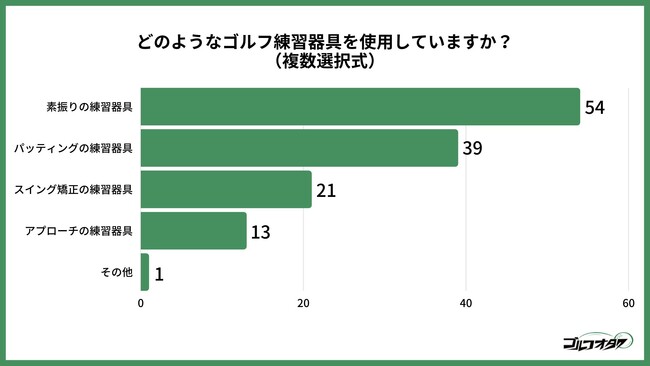 使用しているゴルフ練習器具の種類は「素振りの練習器具」が54票で1位。2位、3位には「パッティングの練習器具」(39票)、「スイング矯正の練習器具」(21票)がランクインしました。