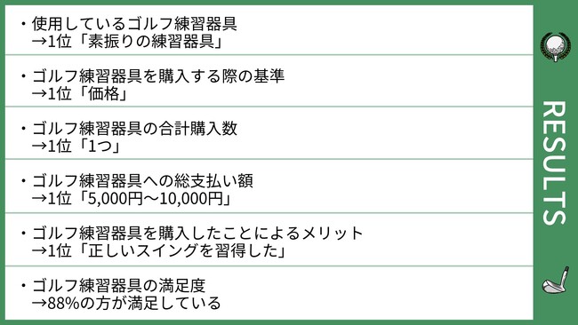 本調査結果ではゴルフ練習器具を購入した結果、88%の方が「ゴルフ練習器具に満足している」と回答しています。また、約75%の方がゴルフ練習器具を購入してから「6ヶ月以内にゴルフが上達した」と回答しています。