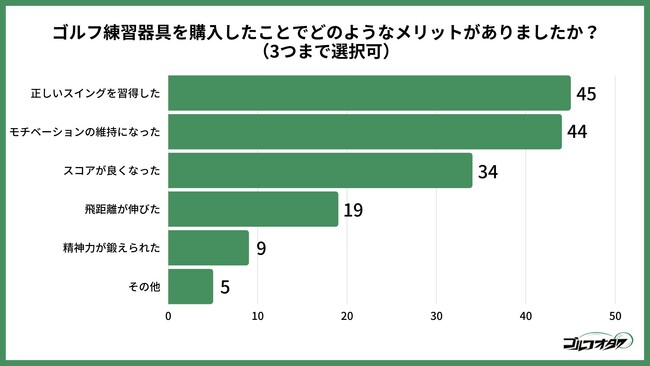 ゴルフ練習器具を購入したことによるメリットでは、「正しいスイングを習得した」が45票で1位。2位、3位には「モチベーションの維持になった」(44票)、「スコアが良くなった」(34票)がランクインしました。