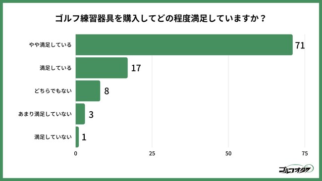 ゴルフ練習器具の満足度では、「やや満足している」が71票で1位。2位、3位には「満足している」(17票)、「どちらでもない」(8票)がランクインしました。