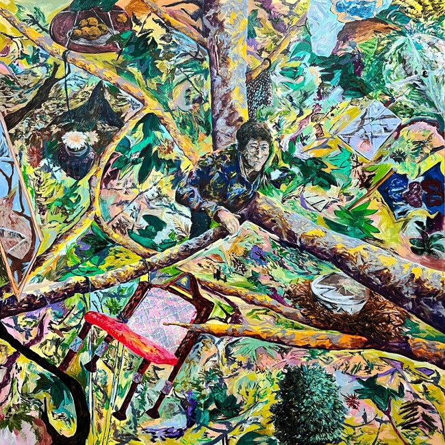 寺本明志(てらもと あかし b.1992)は神奈川県出身で多摩美術大学大学院博士前期課程(修士)絵画専攻油画研究領域を修了し、現在は相模原市のスタジオArt space Kaikas’を拠点に活動しています。寺本は絵画のみならず、過去にはインスタレーションにも取り組み、空間を意識した展示方法や画面構成を一貫して試み続けてきました。これまで発表された作品のほとんどが「Patio(中庭)」と題され、外と内の境界のない中立的な場所に日常的な道具、人やもの、かつてみた景色の断片など統一性のないものを等価に描き込みながら、先に描いたものを足掛かりに次に描くものを考え、そこで起きる事象間に発生する関係性によって、一枚の絵画が紡がれていきます。
