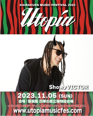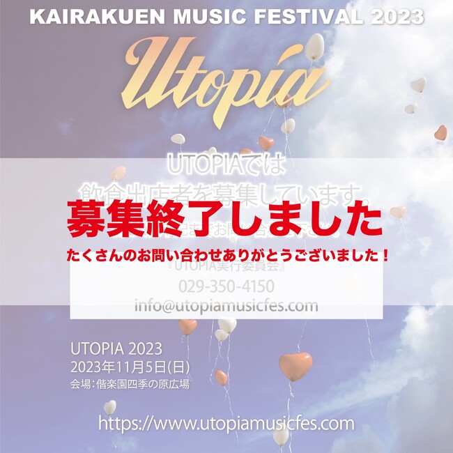 偕楽園音楽祭が新たにUTOPIAと名前を変え、2023年11月5日(日)に、茨城県水戸市の偕楽園四季の原広場特設会場にて音楽フェスを開催致します。国内HIP HOPアーティストが多数出演し、多店舗の飲食ブースが出店するフェスになります。