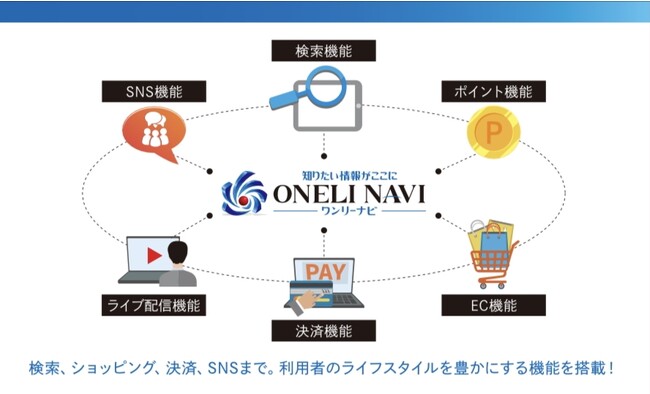 「ONELI NAVI(ワンリーナビ)」は、2023年2月28日にサービスを開始した人々の生活に必要な情報を”1カ所”で検索することができる総合集約型プラットフォームです。全国の店舗や企業を網羅しており、ショッピングから動画配信まで総合的にカバーしています。食事、住まい、ファッションなど日常生活で必要な情報や、仕事の依頼や求人などビジネスに関わる情報、通院や冠婚葬祭、余暇を楽しむレジャーなど娯楽に関わる情報まで、人々が生活する上で必要な情報を”1カ所”で検索することができます。