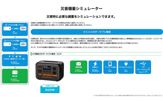 現在、様々なメーカーが様々なポータブル電源を提供していますが、どれを選べば良いかわからないと、多くのご相談をいただきます。そこでEcoSubscでは「災害備蓄シミュレーター」を提供し、非常時に最低限必要な電力に合わせて、ポータブル電源を簡単に選ぶことが可能です。