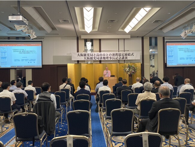 締結式終了後には、『大阪・関西万博におけるインバウンド観光と、日本の観光ショーケース事業について』と題して、溝畑理事長による講演が開催されました。溝畑理事長は、来阪した外国人旅行者を全国へ送客する「観光ショーケース事業」の提唱者でプロデューサーでもあり、万博への期待や万博を通じて世界に発信したいことなどを熱く語られました。