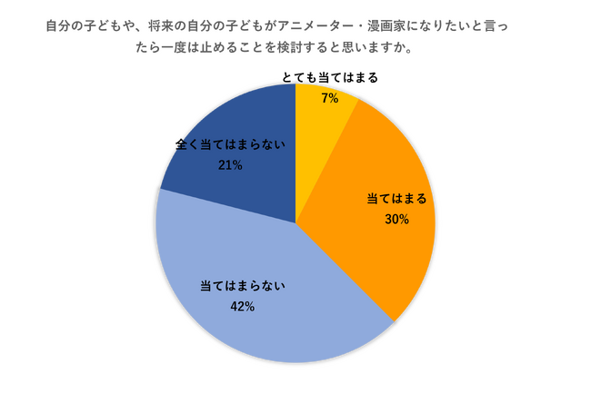 「アニメーター・漫画家の働き方や将来について」聞いた質問では、最も多かった回答が「人気の職業なのでこれからも志す人は多い」で全体の約半数を占めていたにも関わらず、3人に1人が、将来の自分の子どもがアニメーター・漫画家になりたいと言ったら一度は止めることを検討する、と回答。止めることを検討すると答えた75人に理由を聞くと「才能がないと食べていけないイメージがある」に次いで、「忙しくプライベートがない印象だから」(34.7%)「給料が安いと聞いたことがあるから」(30.7%)といった、給与面での待遇面での不安を挙げた。