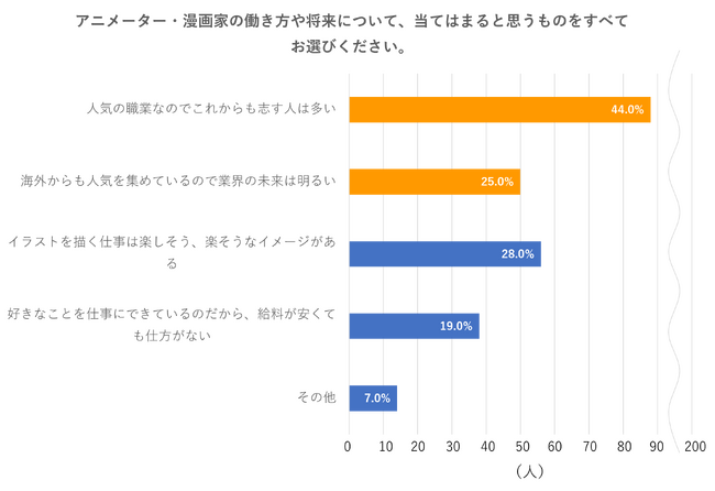 これに比例してか、「アニメーター・漫画家の働き方や将来について」聞いた質問では、最も多かった回答が「人気の職業なのでこれからも志す人は多い」で全体の約半数、44 %を占めました。