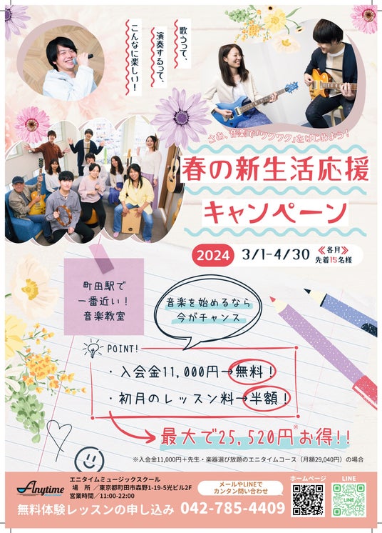 株式会社エニタイムミュージック(本社:東京都町田市、代表取締役社長:岡田 勇志、以下 エニタイムミュージック)は、同社が運営する音楽教室にて春の新生活応援キャンペーンと題し、『入会金無料&初月レッスン料半額のWキャンペーン』を2024年3月1日(金)~4月30日(火)まで実施することをお知らせいたします。