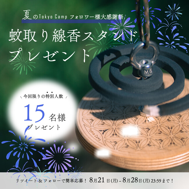 合同会社DRive(本社:大阪府箕面市、代表:吉川了)が運営するキャンプブランド『TokyoCamp(トーキョーキャンプ)』は、夏のフォロワー様大感謝祭企画として、「蚊取り線香スタンドプレゼントキャンペーン」を8月21日(月)より1週間公式X(旧Twitter)とInstagramで同時開催しています。TokyoCampプレゼントキャンペーン史上最大規模となっておりますので、ぜひご参加ください。