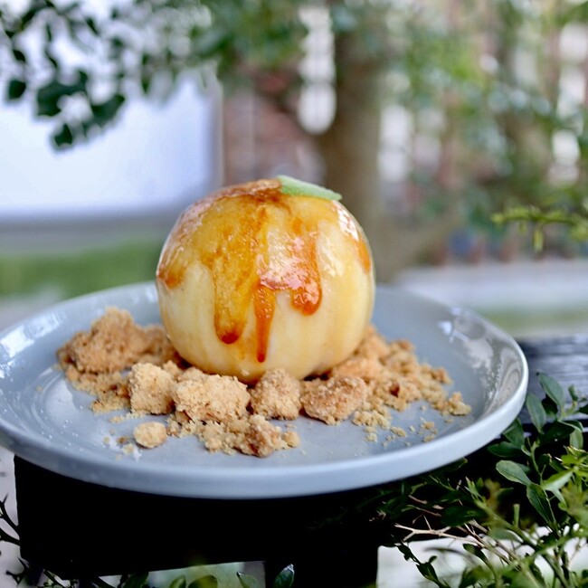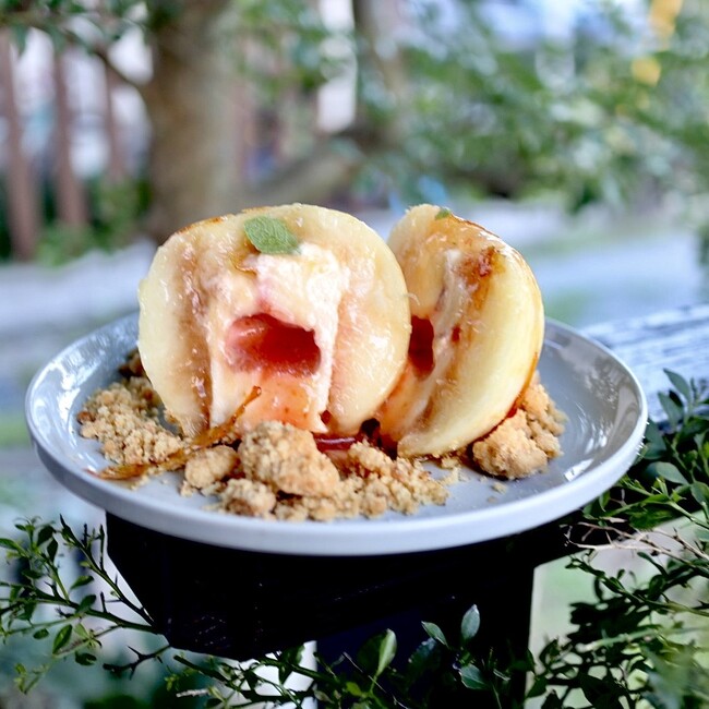 桃を丸ごと使用したインパクト絶大なケーキ。ブリュレのパリッと食感と桃のジューシさがベストマッチ