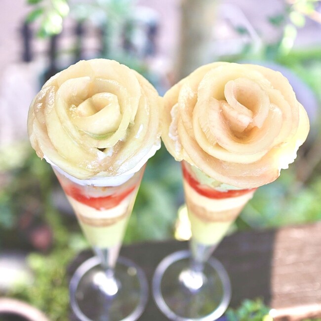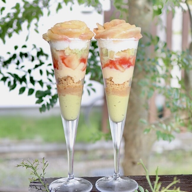 最上部は薄切りの桃で組み立てられた薔薇が美しく、運ばれてきた瞬間から笑顔になれるビジュアルが最高なパフェです。