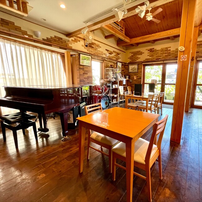店内は落ち着いた空間にブラウンカラーのグランドピアノやドラムセットが並び、非日常的な雰囲気を感じられます。