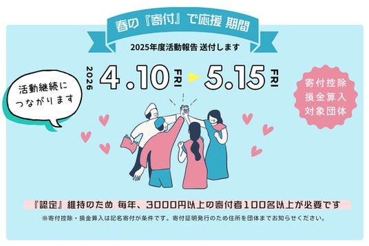2026年春に認定NPO法人の認定を取得しました。認定を維持するには、毎年3,000円以上の寄付者が100人以上必要です(PST基準)。この基準を確実に満たし、活動を継続・拡大していくために、初めての寄付キャンペーンを実施します。
