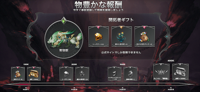 ・公式サイト登録者限定: 青狼獣、トーパズ×100、優れた星光草×5、砕けた宝石パック×5