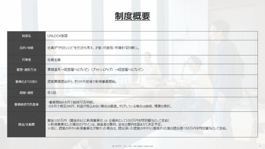 WCTCでは、社員一人ひとりが自らの「やりたいこと」をゼロから考え出し、自身の才能・可能性、そして市場を自ら切り開いていくことを支援する「UNLOCK制度」を導入しました。これは、社員の内なる情熱を引き出し、挑戦の機会を提供することを目的とした社内の新規事業提案制度です。
