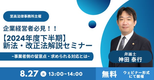 本セミナーでは、2024年度下半期に施行される法改正について触れつつ、特に事業者に対応が求められるフリーランス保護新法のポイントと対応策について当事務所の神田弁護士が予防法務・臨床法務の観点から解説します。